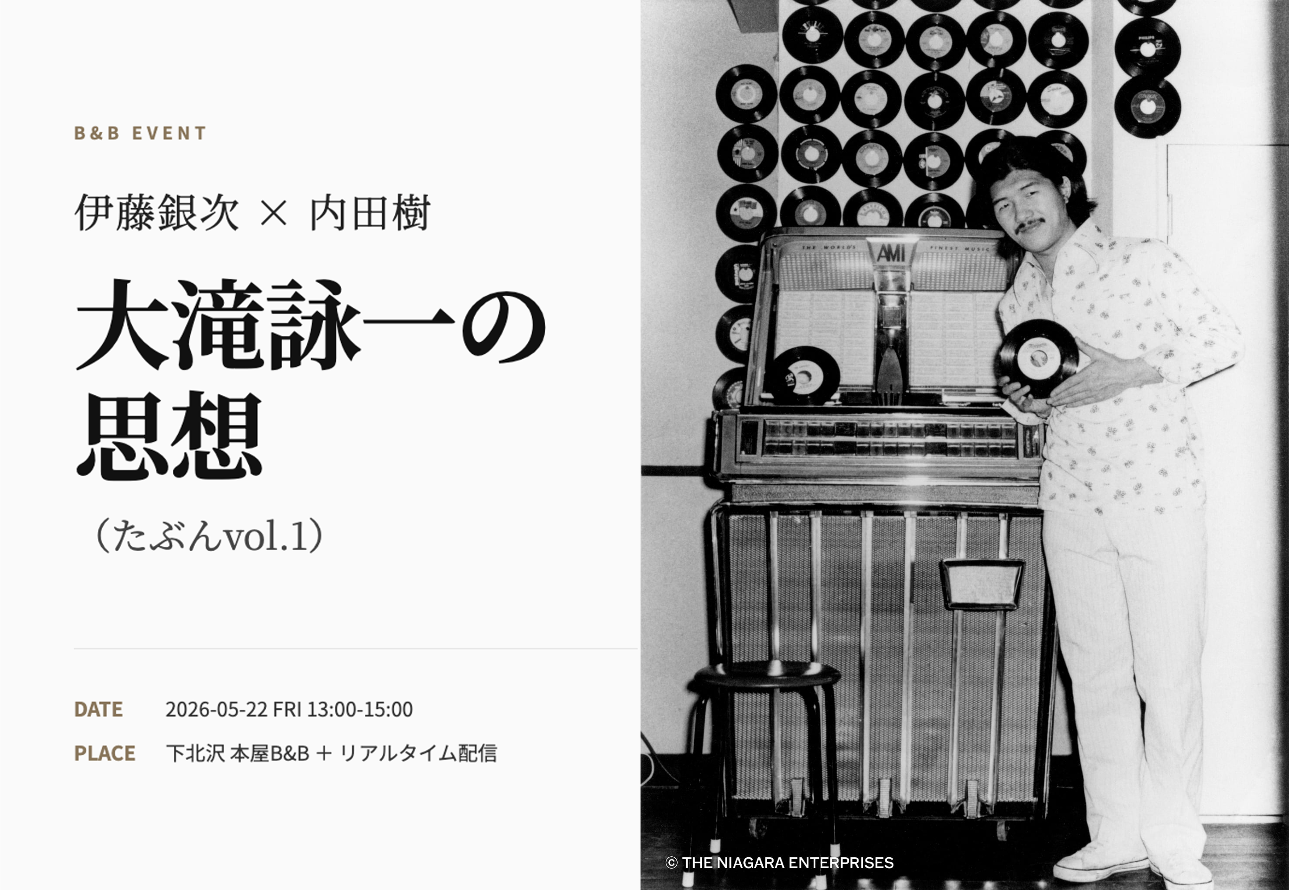 そこで今回、B&Bでは その人となりをつぶさに見てきた、自称(!)「一番弟子」の伊藤銀次さんと、大滝さんを「心の師匠」として尊敬しているという内田樹さんをお迎えしてトークイベントを開催します。