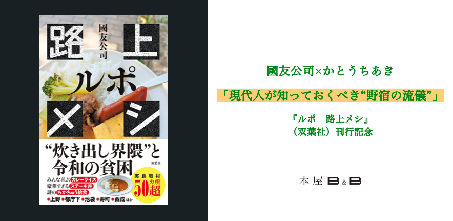 出演は、著者の國友さん。ゲストとして、旅コミ誌『野宿野郎』編集長で、フリーライターのかとうちあきさんをお迎えします。