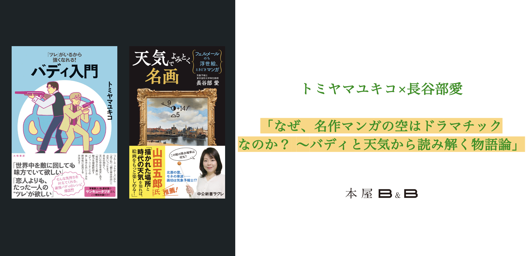 ライター・マンガ研究者として、食やサブカルチャー、そして「女子」の生態を鋭く分析するトミヤマユキコさん。 東京造形大学講師としてマンガを含む「天気とアート」を研究する傍ら、気象予報士として、空模様から文学や映画の登場人物の心情を読み解く長谷部愛さん。