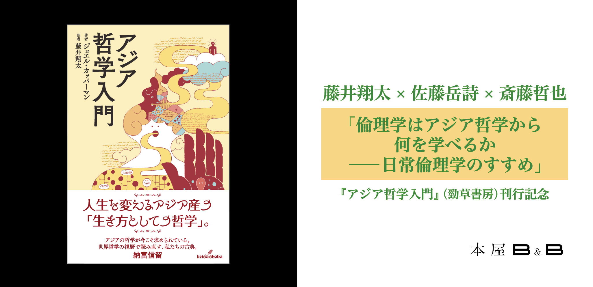 登壇者は三名です。『アジア哲学入門』の訳者・藤井翔太さん、『20世紀のオックスフォードでメタ倫理学はいかに発展したか』において英語圏の(メタ)倫理学の展開を詳細に跡づけた、「日常倫理学派」を自称する佐藤岳詩さん、そして『哲学史入門』シリーズ全体の企画・構成を手がけるとともに、『哲学用語図鑑 完全版 西洋哲学・中国哲学・日本哲学』の監修者としても知られ、西洋哲学・アジア哲学の双方に幅広い知見をもつ斎藤哲也さんをお迎えします。
